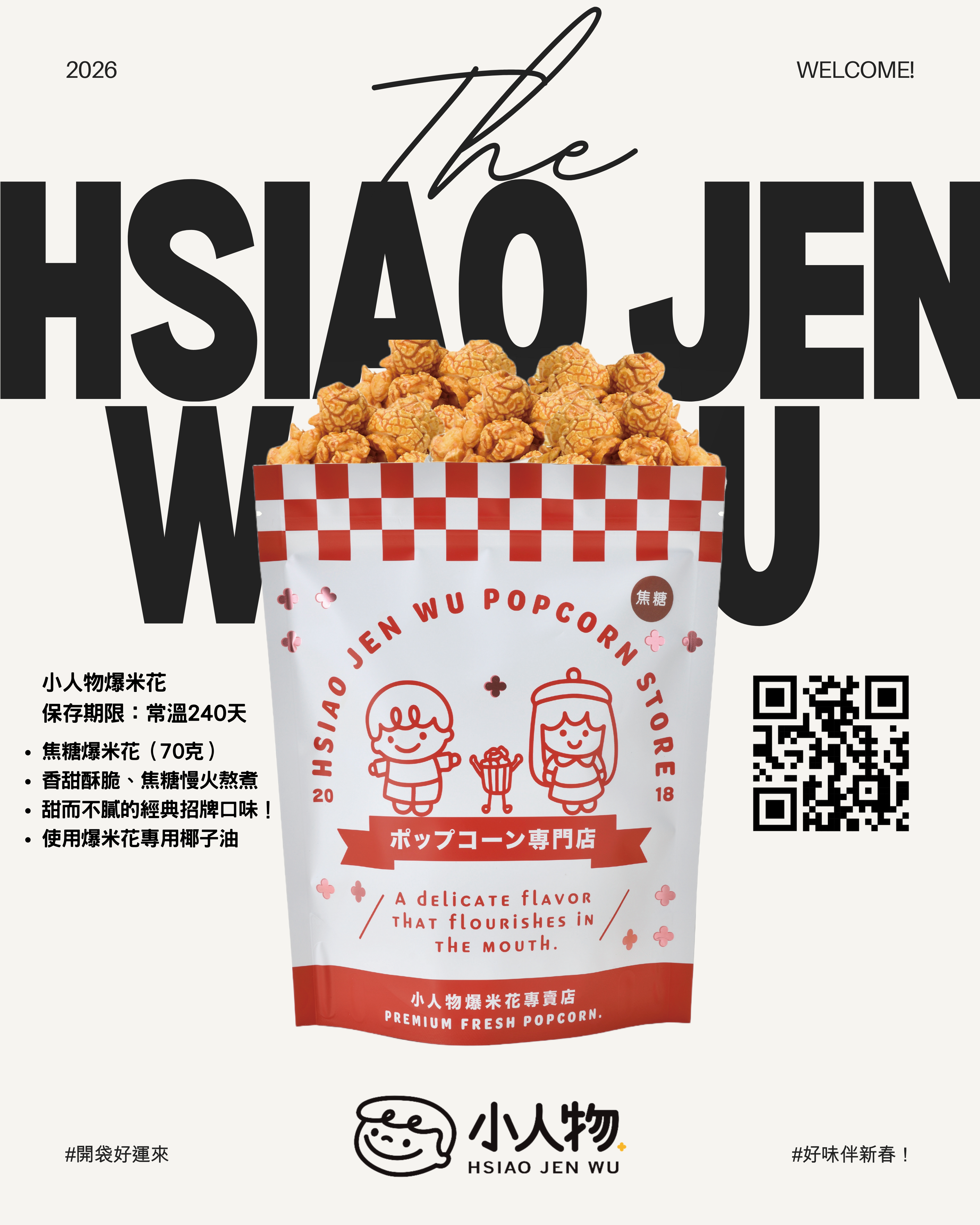 🔹焦糖口味爆米花(Caramel Popcorn)是『小人物爆米花Hsiao Jen Wu Popcorn』的明星商品,也是銷售第一名的熱門風味。 🔹海鹽口味爆米花(Sea Salt Popcorn)是『小人物爆米花Hsiao Jen Wu Popcorn』的熱銷商品,是一款強調簡單無厚重調味、純粹簡單卻耐吃、鹹香風味的爆米花。